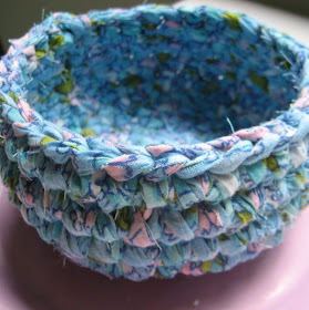 Ever since making those jersey knit nursery baskets, I've wanted to see what would happen if I used my large rug hook to make a basket out of regular cotton and cotton blend sheets. Since I had this fabric bundle all set aside, I went for it. Monday, May 18, 2009